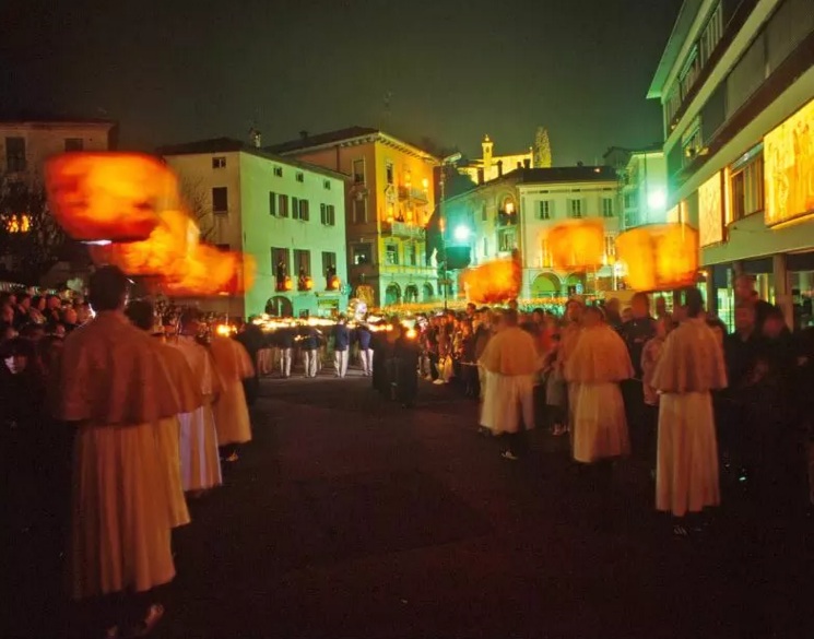 The Way of the Cross in the town of Mendrisio is a must-do. The town is filled with “Trasparenti” or drawings made on transparent cloths from the 17th and 18th centuries, showing pictures of the passion of Christ, illuminated from within. Over 600 people participate in the processions and thousands gather up to see it. (All photos here below from www.processionimendrisio.ch).